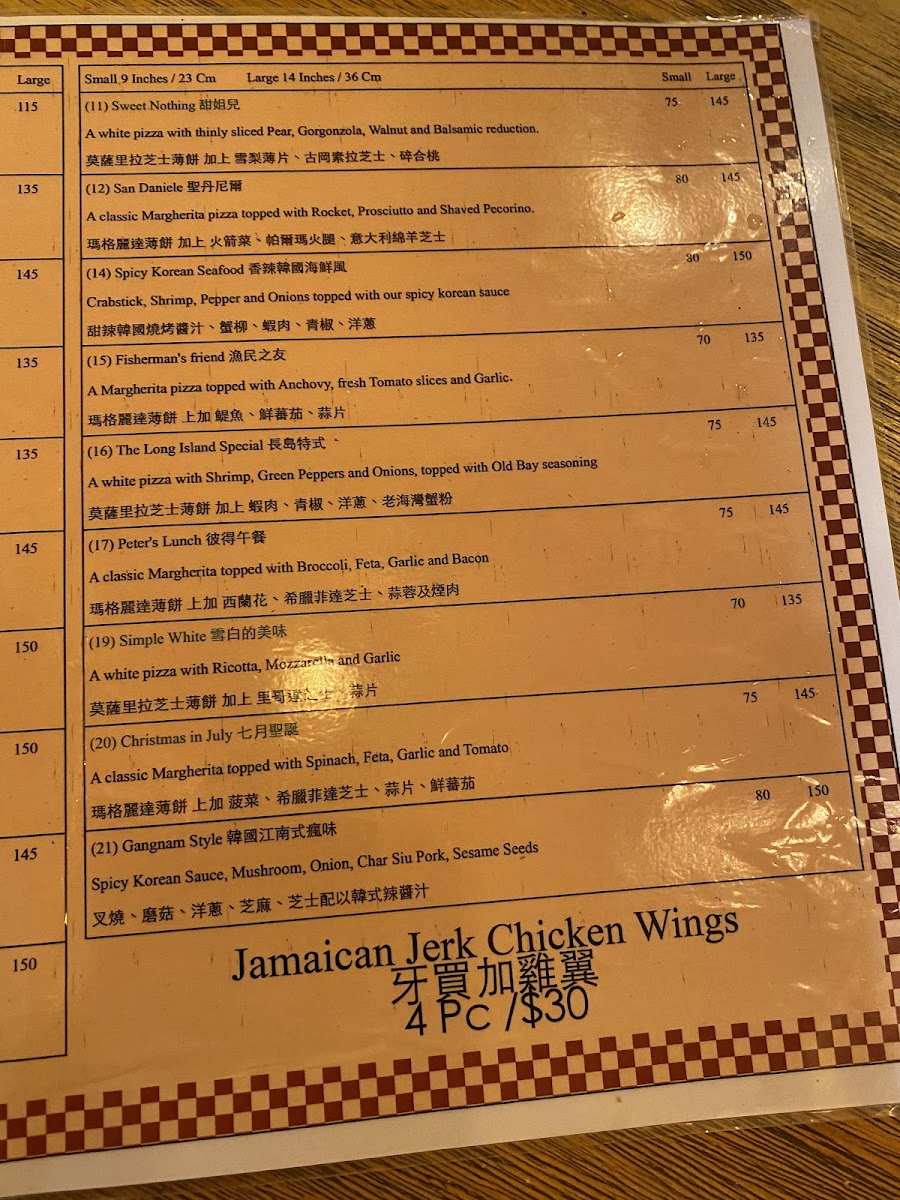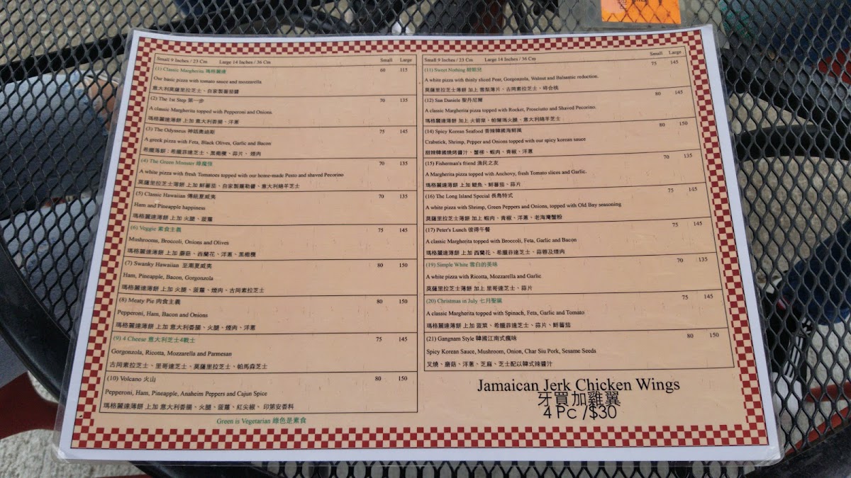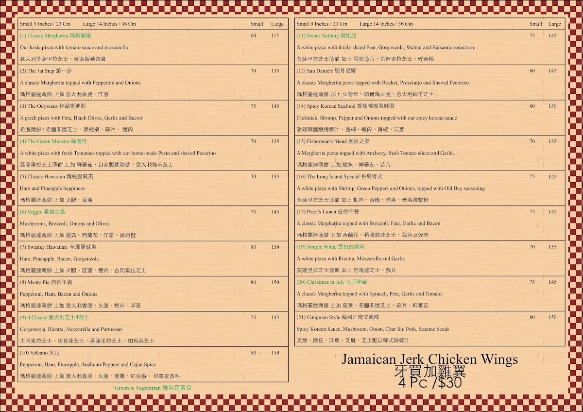 Those seeking something more adventurous will enjoy the 火山薄餅 (Volcano Pizza), which brings bold and fiery flavors, designed for fans of spicier dishes. To complement the pizzas, the 牙買加雞翼 (Jamaican Chicken Wings) are a popular choice, offering a crispy and flavorful accompaniment with a touch of Caribbean influence.